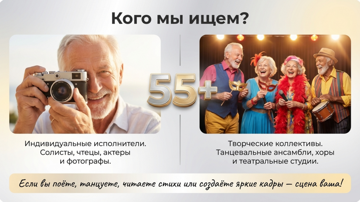 «Позитив в серебре» — это конкурс для тех, кто любит творчество, активную жизнь и не боится заявить о себе. Это возможность выйти на новую сцену, получить признание, вдохновить окружающих и стать частью большого доброго проекта.