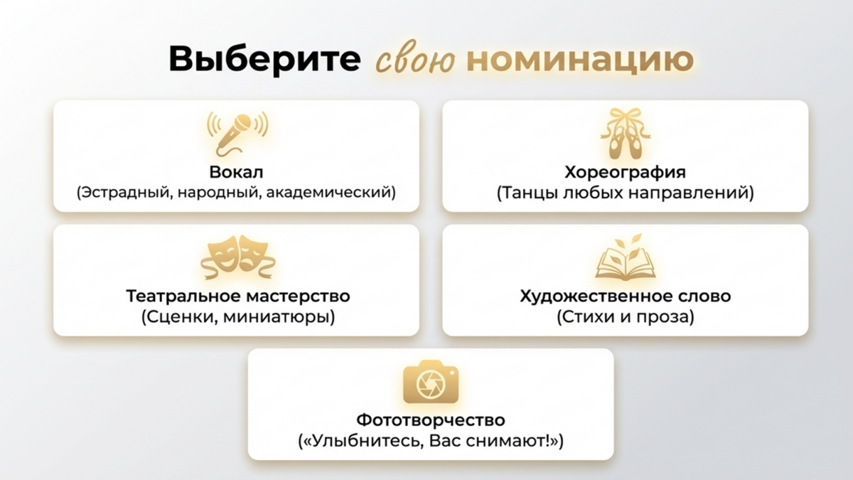 Участников ждут следующие номинации: вокал, хореография, театральное мастерство, художественное слово и фотоконкурс.